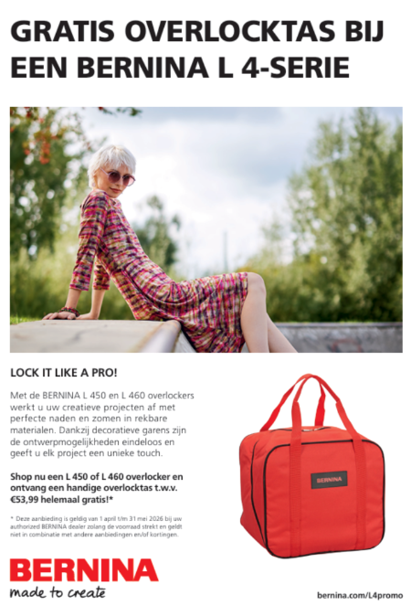 Vanaf 2 april zal een promotie starten bij Bernina op de L-450 en de L-460. Bij aankoop van één van beide overlockmachines zal een gratis draagtas meegeleverd worden.